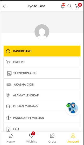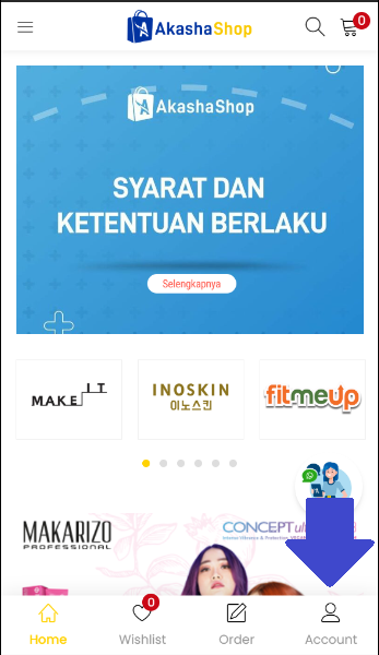 1. Anda dapat melakukan registrasi di Akasha Shop dengan mengklik tombol “Account” pada pojok kanan bawah.