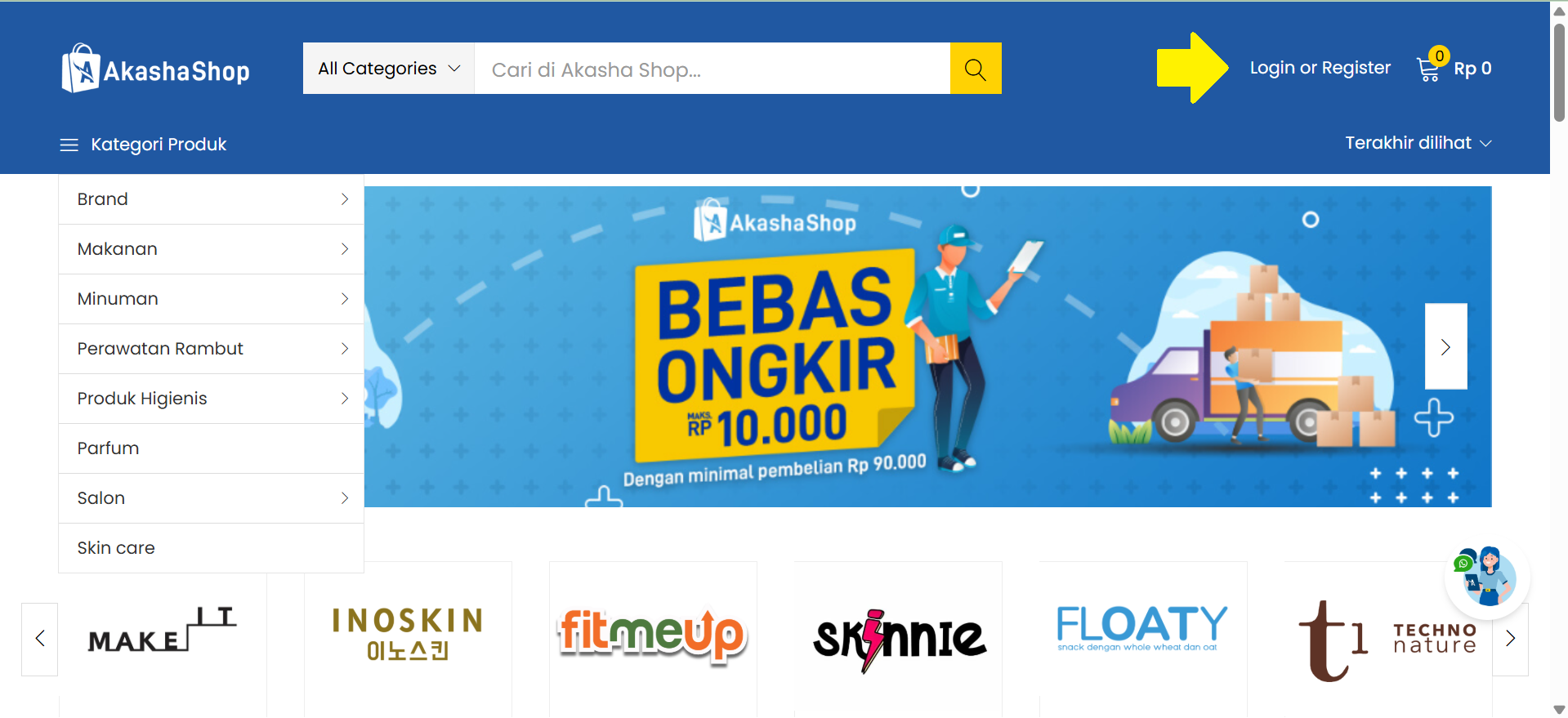 1. Anda dapat melakukan registrasi di Akasha Shop dengan mengklik tombol “Login or Register” pada pojok kanan atas.
